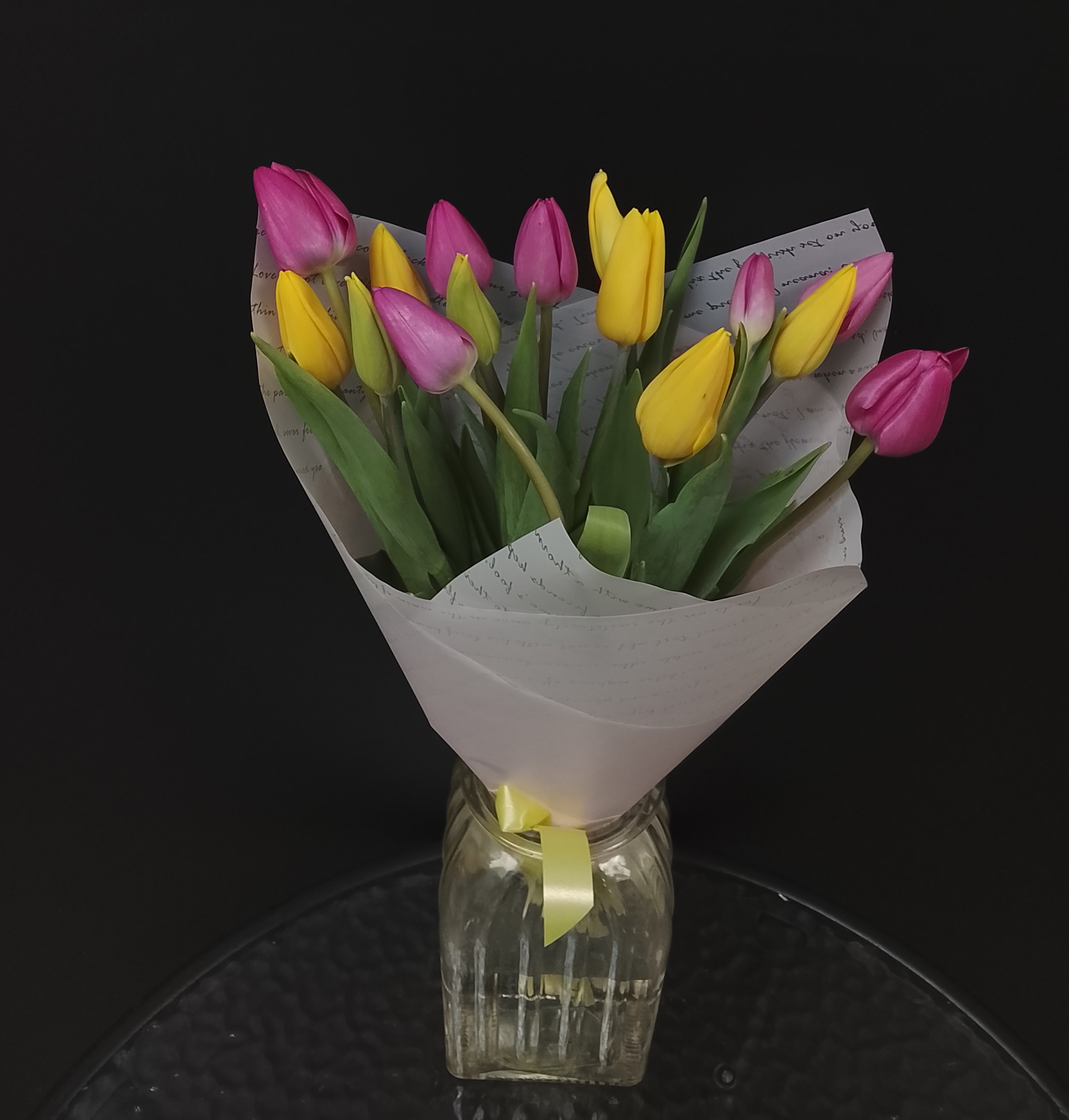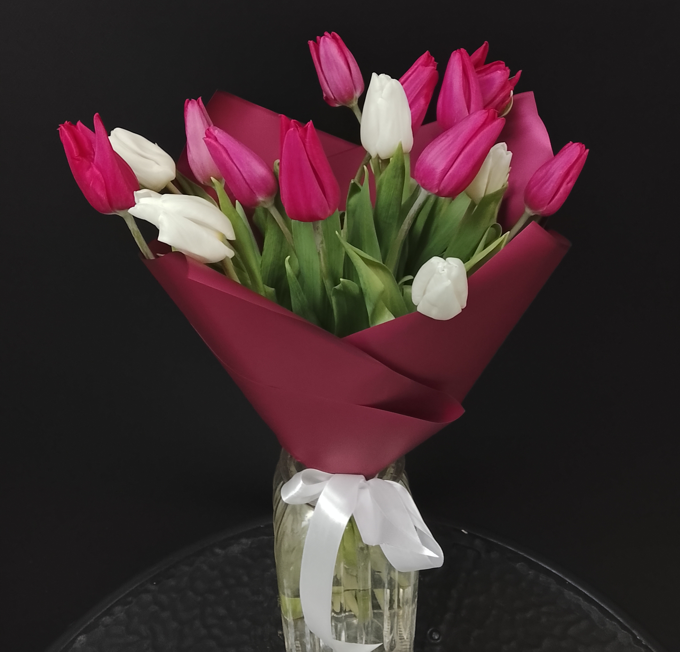 Состав: тюльпаны 15шт, упаковка матовая пленка, лента атласная.